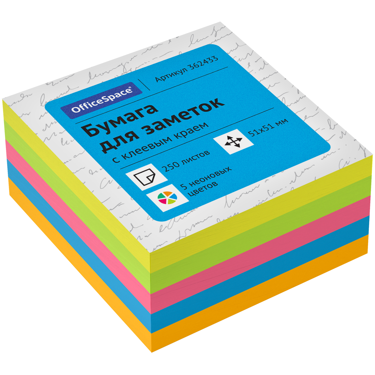 Блок бумаги для записей с клеевым краем OfficeSpace подойдёт для оперативного сохранения важной информации. Плотность бумаги для заметок составляет 75 г/м2. Размер листа в блоке для заметок 51*51 мм. В блоке 250 листов пяти неоновых цветов. Блок квадратной формы имеет клеевой край, позволяющий прикреплять стикер к любой поверхности.
