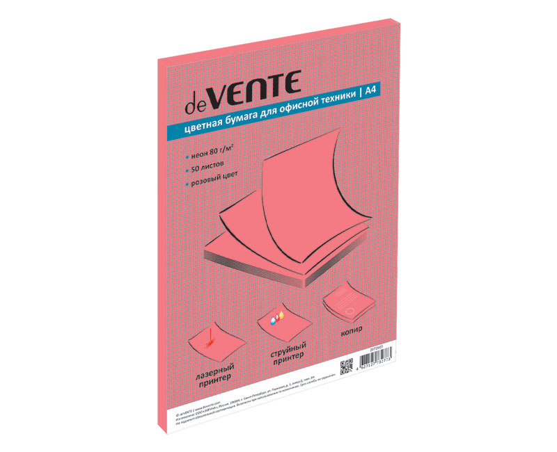 Бумага цветная для офисной техники "deVENTE" A4 50 л, 80 г/м², неон розовый, картонная подложка, в термоусадочной пленке