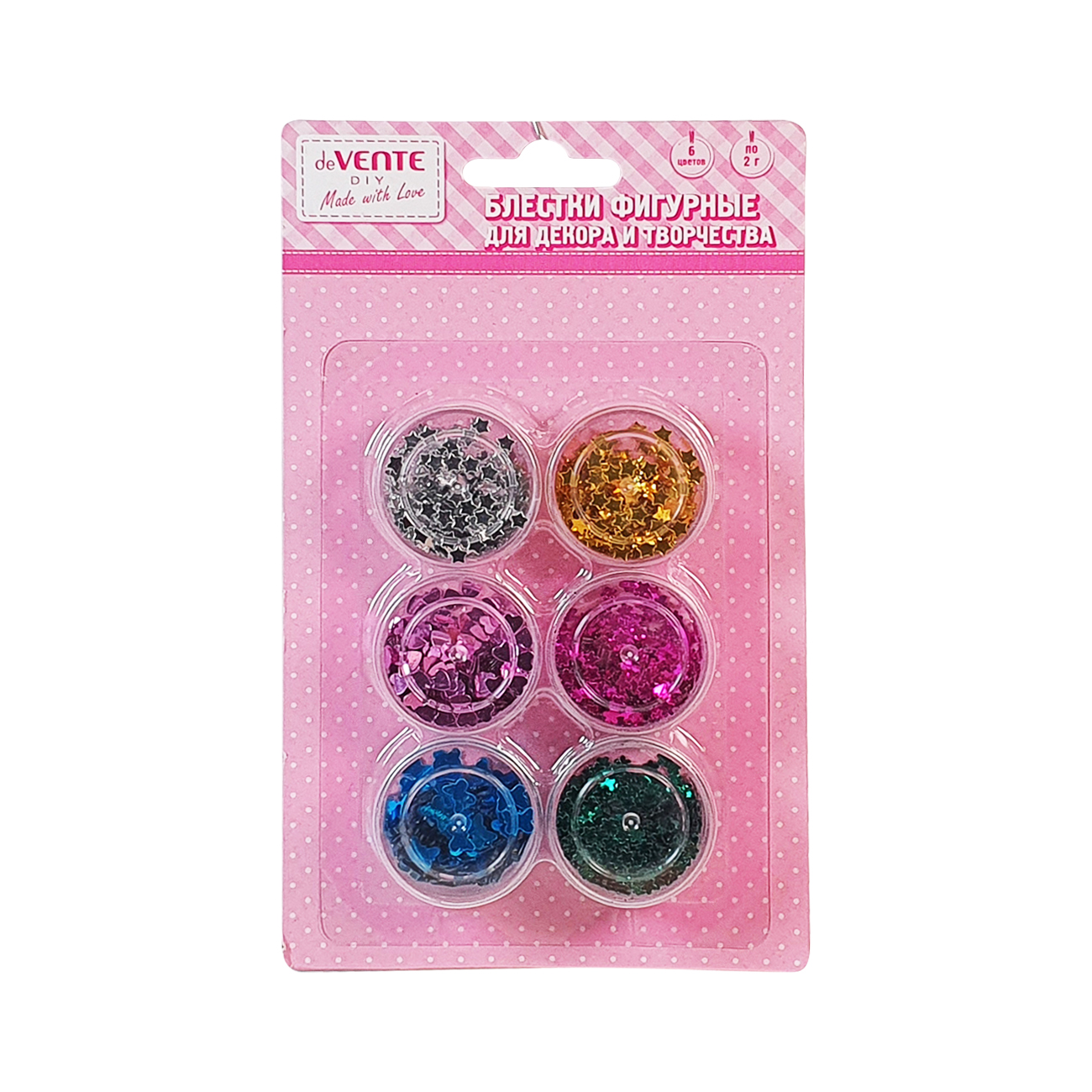Блестки (глиттер) фигурные для декорирования в ассортименте "deVENTE. Fashion" размер блесток 3-4 мм, 6 цветов по 2 г, в картонном блистере
