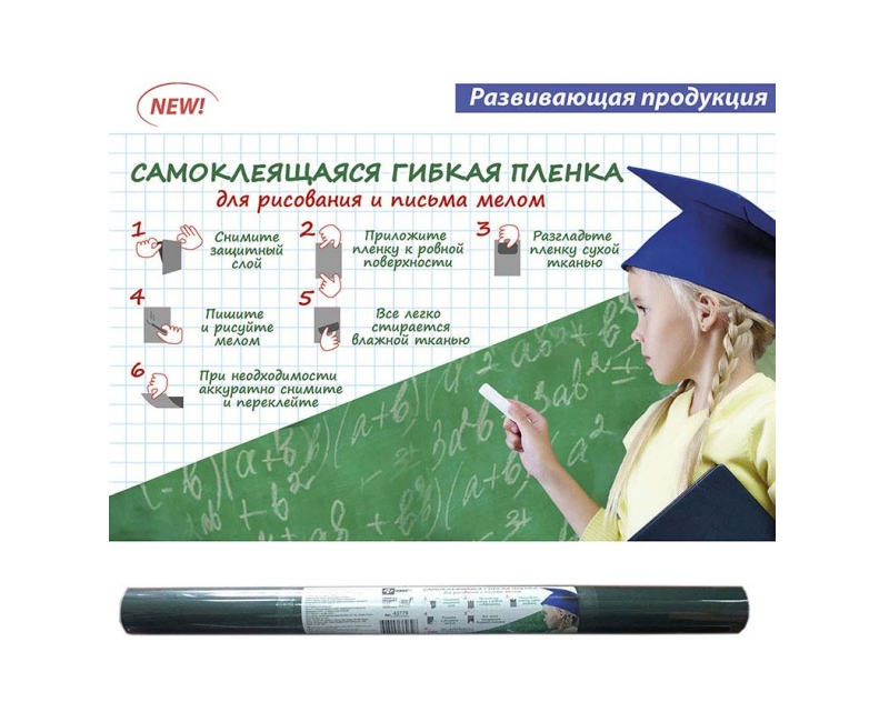 Пленка самоклеящаяся д/рисов. и письма мелом арт.43780/36 ТЕМНО-ЗЕЛЕНАЯ 45х200 см, полипропилен с клеев. покрыт., в наборе с мелками (3 шт). До 10000 стираний