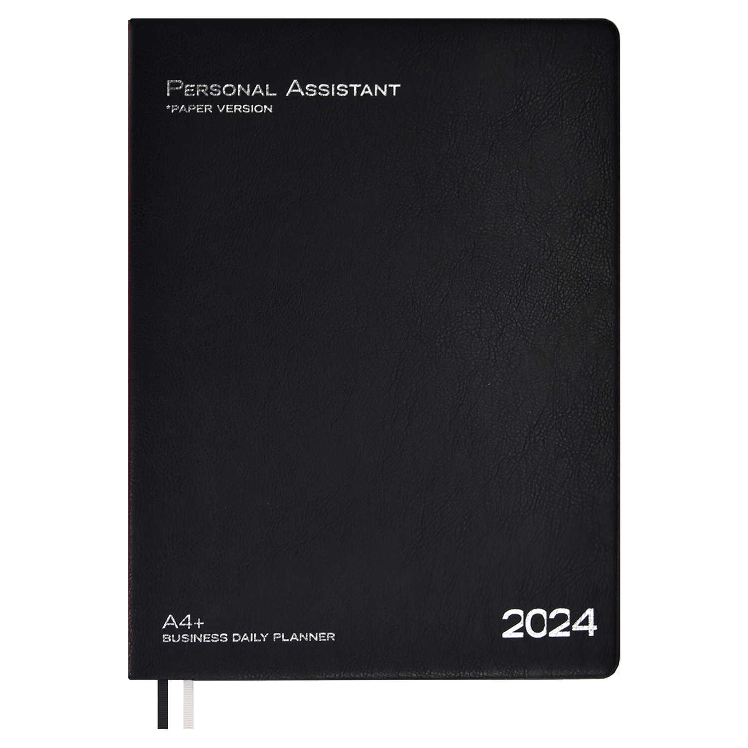Ежедневник датированный 2024 ESCALADA, А4+, 120 л., арт. 63715/ 10 ШЕВРЕТ ГЛОС ЧЁРНЫЙ (кожзам: 222х303 мм, мягкий переплёт, съёмная обложка, материал обложки: искусственная кожа "Шеврет глосс"; декор: тиснение фольгой; способ крепления блока: вставной блок, ниткошвейный; вн. блок: 120 л., белый офсет 70 г/м², печать в две краски (линия), справочный материал: есть; перфорация углов блока: нет; закладка/-и: два ляссе; каптал: нет; форзац: печать пантоном; особенности: 1 лист с наклейками в комплекте, карман для визиток; персонализация возможна: да; индивидуальная упаковка: промостикер + ПЭТ-пакет)