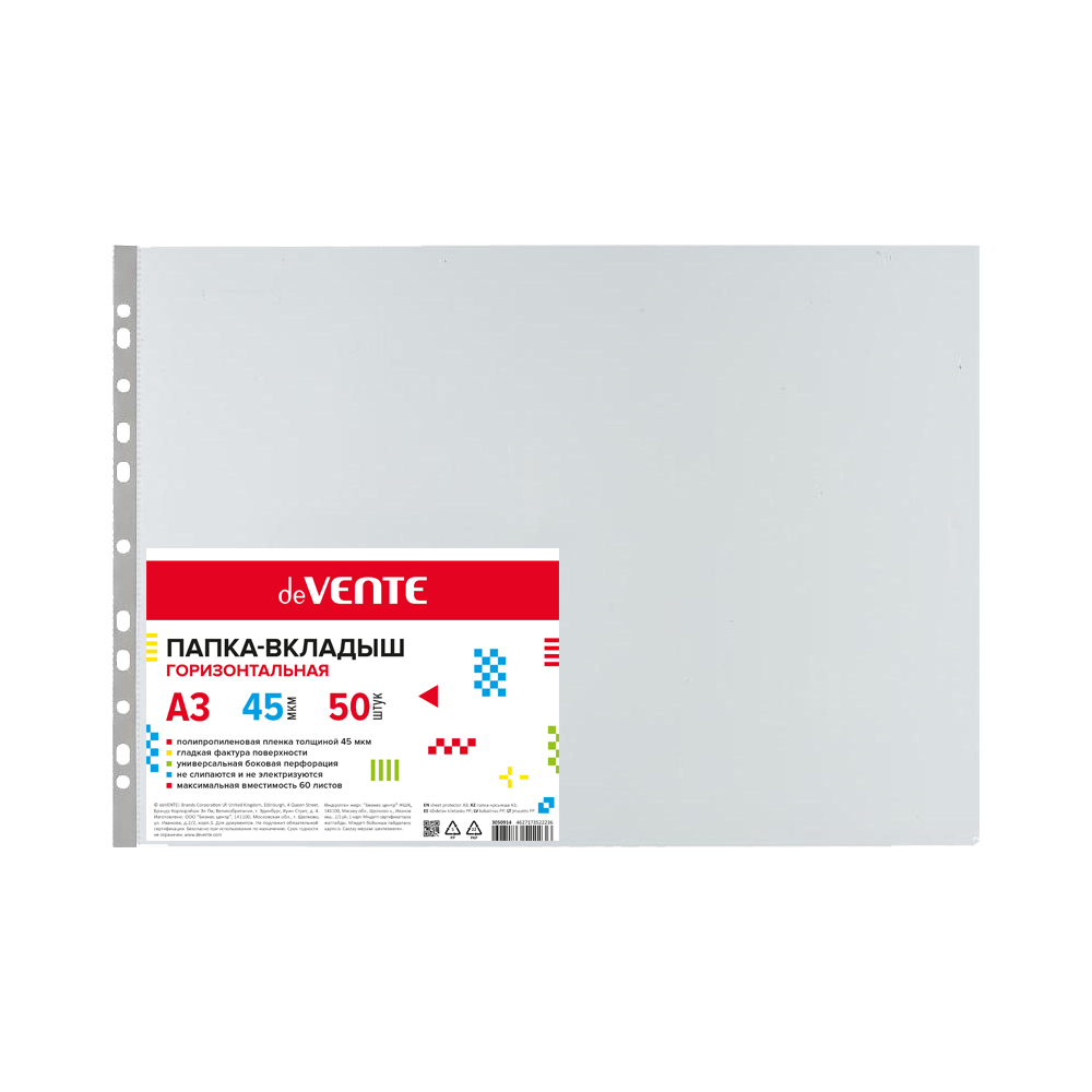 Код товара: 00-32846Файлы с перфорацией А3 горизонтальная deVENTE 50шт/упак 45мкм, глянцевые 3050914