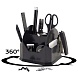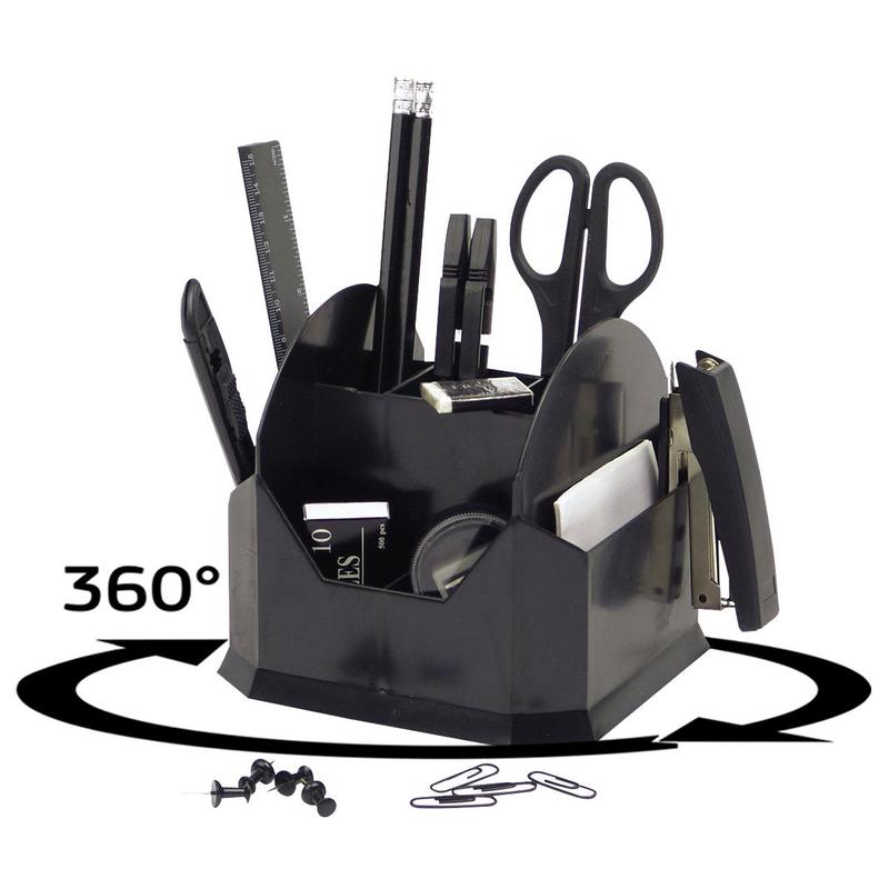 Настольный набор Attache JC848 прямоугольной формы изготовлен из черного пластика. Имеет вращающуюся на 360 градусов основу. Настольный набор комплектуется ножницами, двумя карандашами с ластиком, канцелярским ножом, двумя шариковыми ручками, линейкой, скобами для степлера, точилкой, степлером, силовыми кнопками, блоком бумаги для заметок, ластиком, скрепками и подставкой. Всего 15 предметов. Размер изделия без наполнения (ДxШxВ) — 148×138×130 мм. Размер изделия с наполнением (ДxШxВ) — 148×138×200 мм.