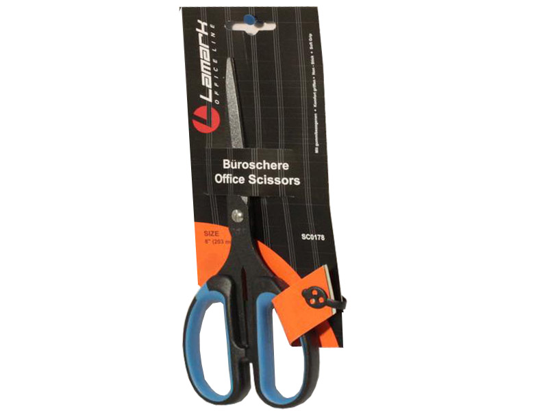 Ножницы 20,3 см, тефлоновое покрытие лезвия, эргономичные пластиковые ручки с мягкими вставками на бумажном держателе.