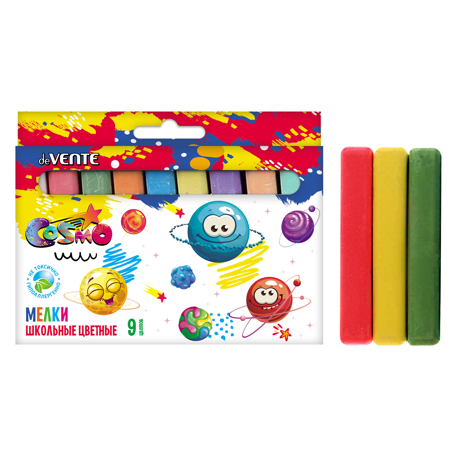 Мелки школьные "deVENTE. Cosmo" прямоугольные цветные 09 цветов, в картонной коробке с европодвесом