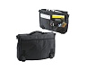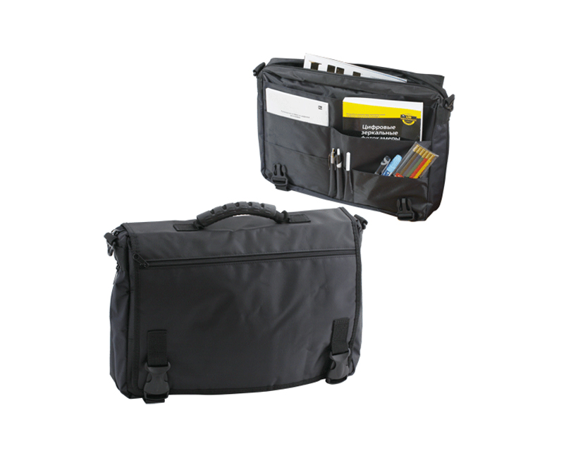 Функциональная сумка для документов с множеством отделений, выполнена из ткани. Клапан застегивается с помощью двух пластмассовых "карабинов".