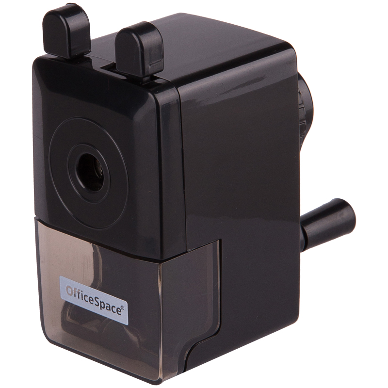 Одно отверстие. Карандаш фиксируется с помощью металлических зажимов и затачивается при вращении ручки. Цвет черный. Упаковка в индивидуальную прозрачную ПВХ-коробку со стикером.