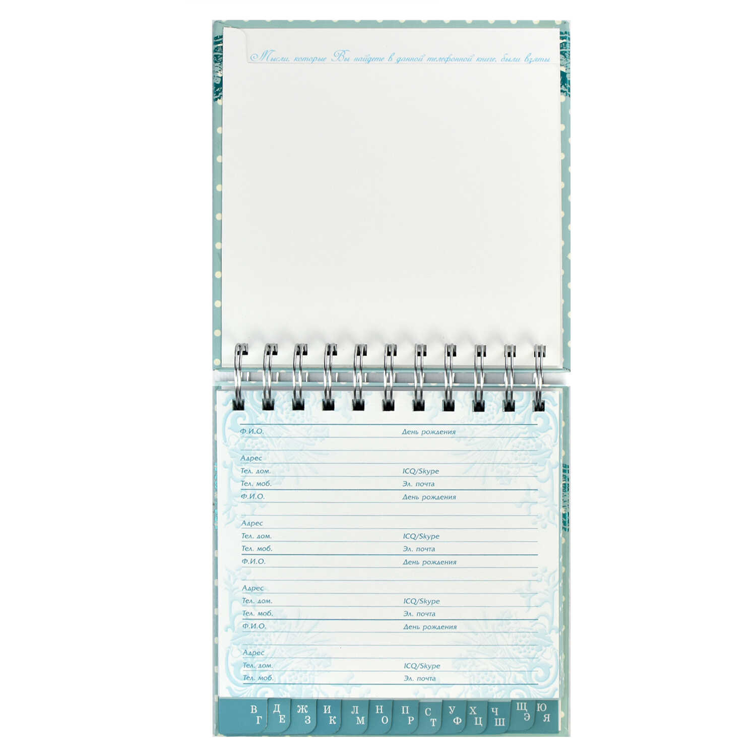 Телефонная книжка арт.32065 НЕЖНОСТЬ(с алфавитной вырубкой, 150*150 мм, 14 разделит, 56 л офсет, евроспираль, обложка 7БЦ, тисн.бирюзовой фольгой)