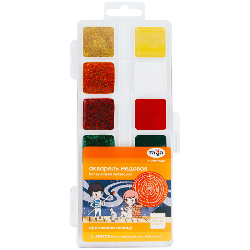 Краски акварельные 12цв. Гамма Оранжевое солнце 6цв. с блестками+6цв.классические 291020207