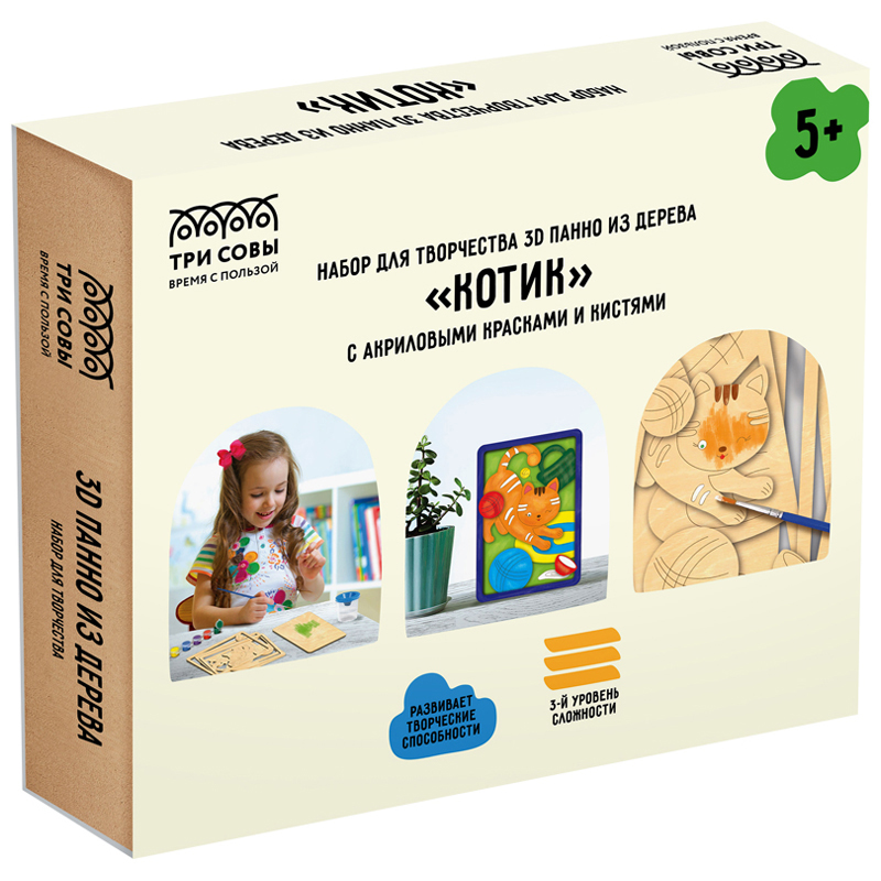 Код товара: 00-34646Набор для творчества ТРИ СОВЫ 3D панно из дерева Котик , с акриловыми красками и кистями 3D_41943