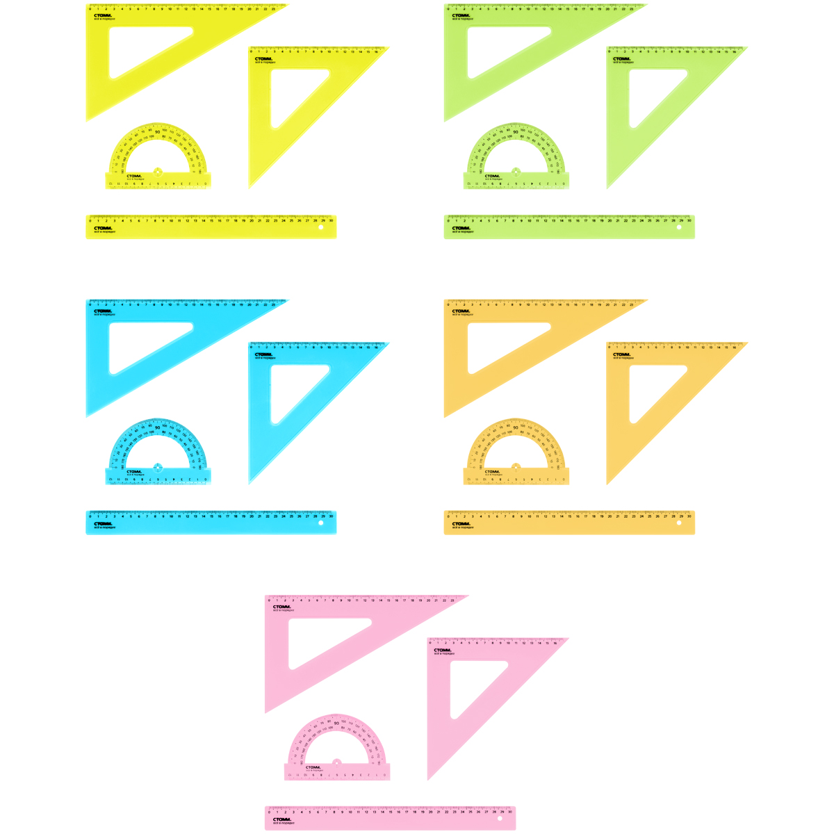 Линейки в наборе СТАММ (2треуг., лин. 30см, тр-тир) прозрачный, неоновые цвета, ассорти НЧ-30523